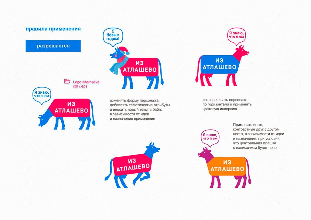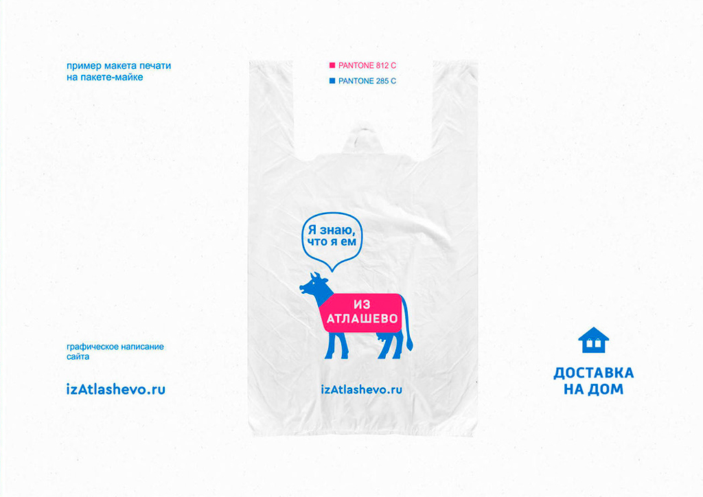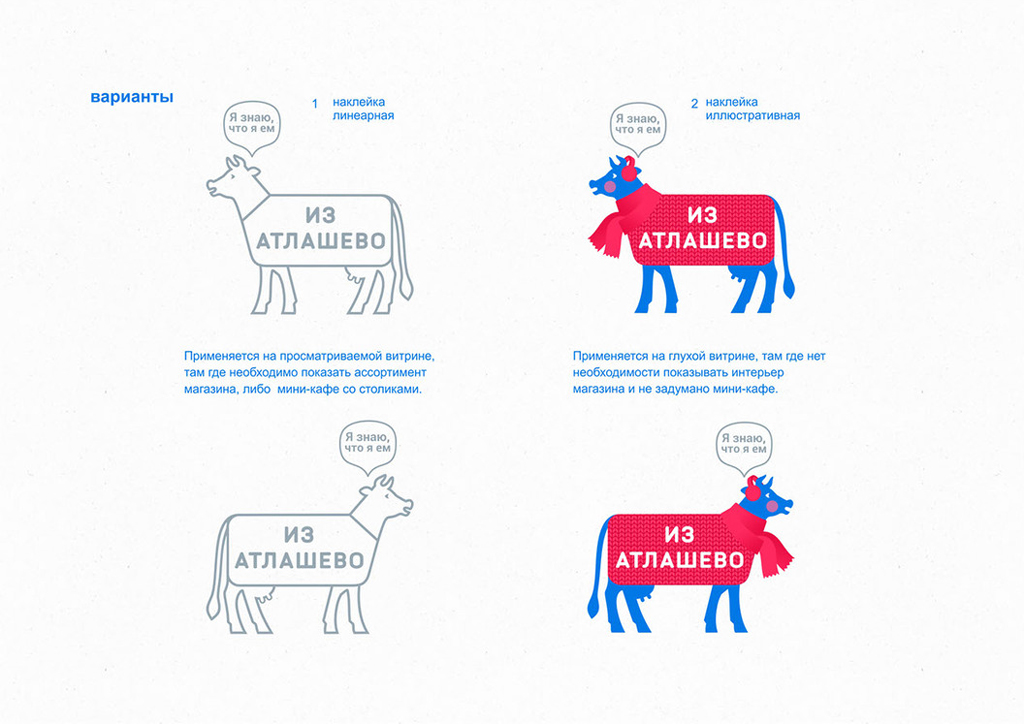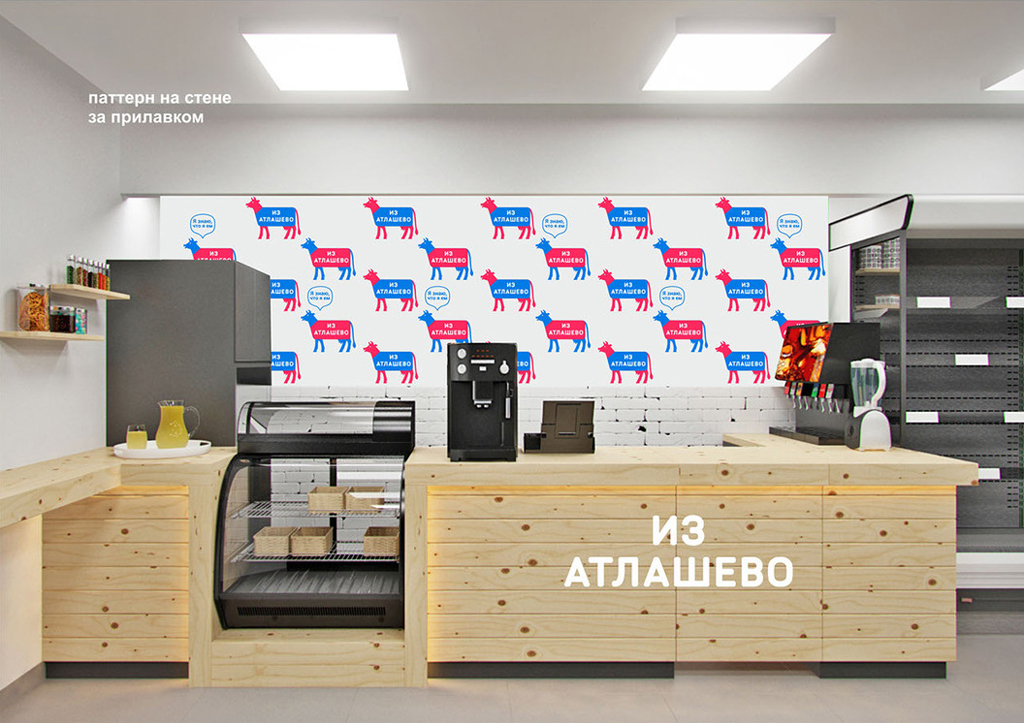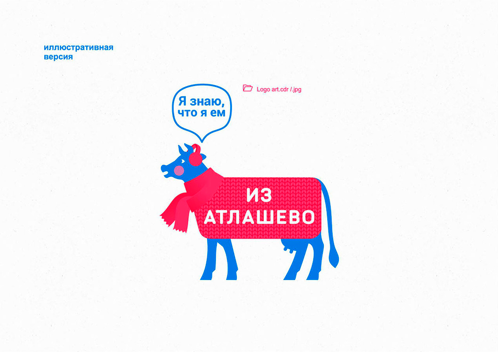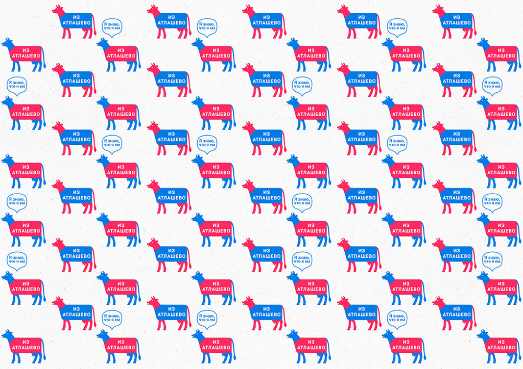 «Из Атлашево» — бренд фермерских магазинов в Чувашии. Основная продукция — молочные и мясные изделия. Для заказчика разработан фирстиль, включающий упаковку самих магазинов. Логотип–маскот является живой коммуникацией с покупателем: он рассказывает о продукции, условиях содержания животных, полезных качествах и преимуществах продуктов.